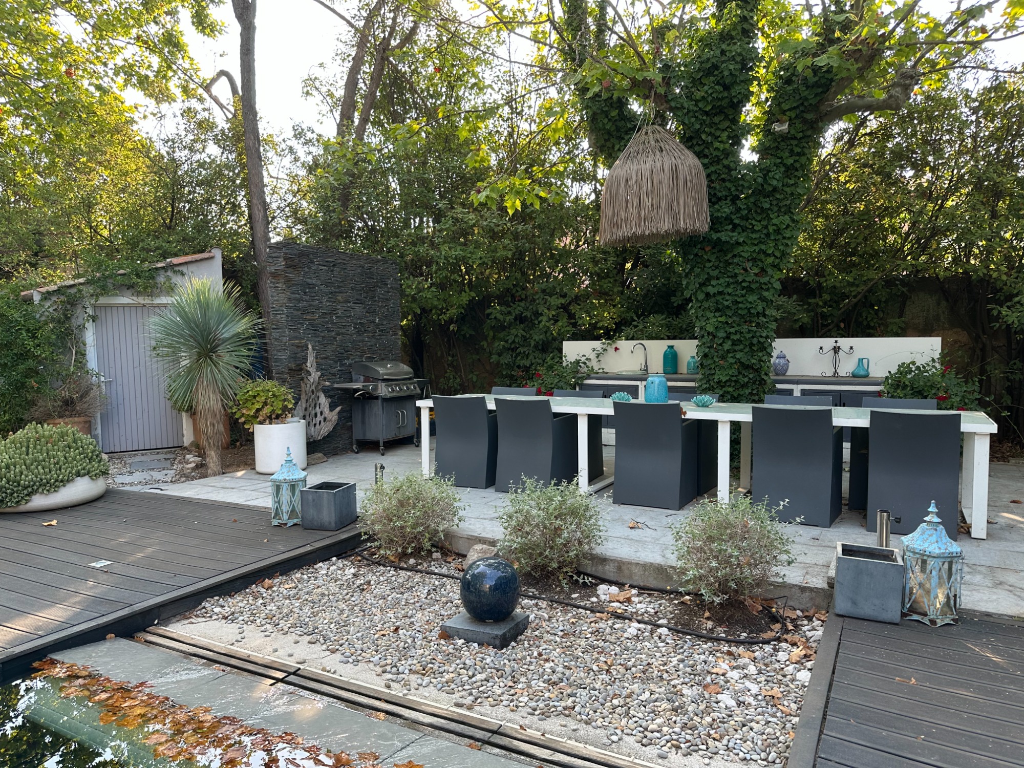 Le terrain merveilleusement arboré, fleuri et parfaitement entretenu est équipé d'un arrosage automatique, d'une pergola avec une cuisine d'été, d'une grande piscine avec terrasses, d'un garage et d'un car-port