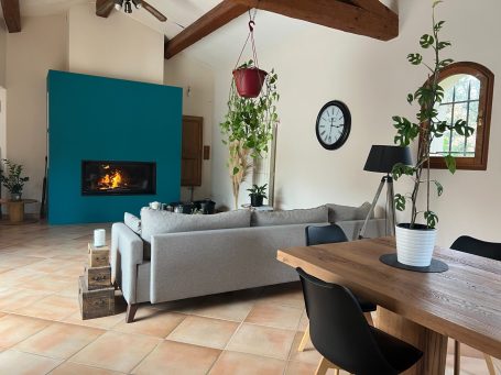 - un grand espace salon avec cheminée à foyer fermé (grande taille) et salle à manger